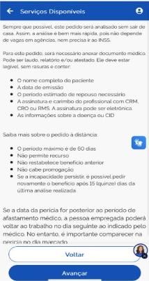- Na tela seguinte, leia com atenção as orientações sobre o benefício por incapacidade e avance para a próxima etapa clicando em “Avançar”;