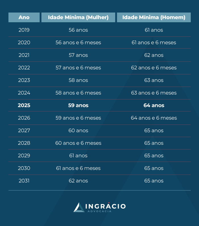 - idade progressiva: esta é a regra que mais se conecta à sua realidade. Ela exige um tempo de contribuição (25 anos para elas, 30 para eles) e uma idade mínima que sobe 6 meses a cada ano: