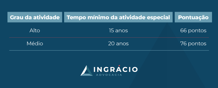 Conforme expliquei anteriormente, a regra de transição da aposentadoria especial exige o cumprimento de um tempo de atividade e de uma pontuação, ambos conforme o grau de risco da atividade.