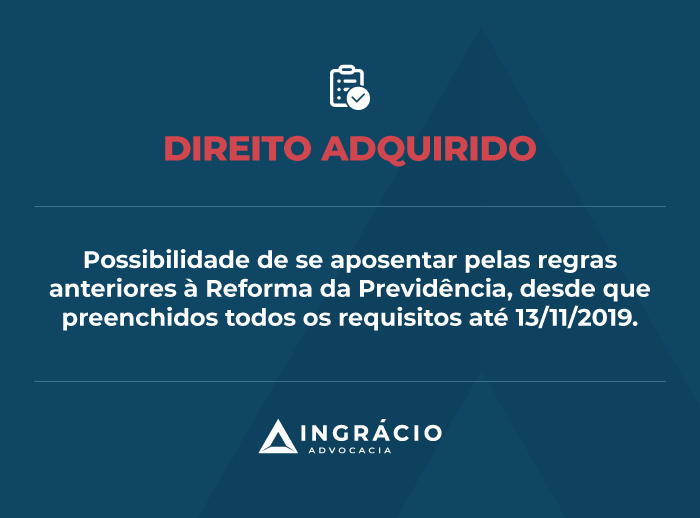 Quando se trata de direito adquirido às regras anteriores à Reforma, seja para a aposentadoria por tempo de contribuição ou por pontos, é necessário verificar se os requisitos foram alcançados até 13/11/2019.