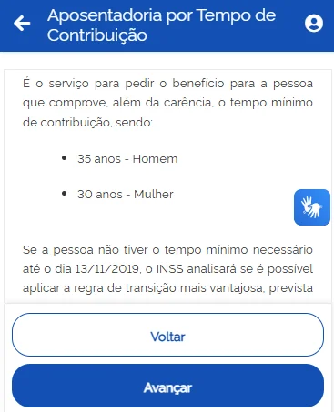 Por isso, caso você queira a regra de transição do pedágio de 50%, por exemplo, clique em “Aposentadoria por Tempo de Contribuição”, já que as regras de transição decorrem da aposentadoria por tempo de contribuição.