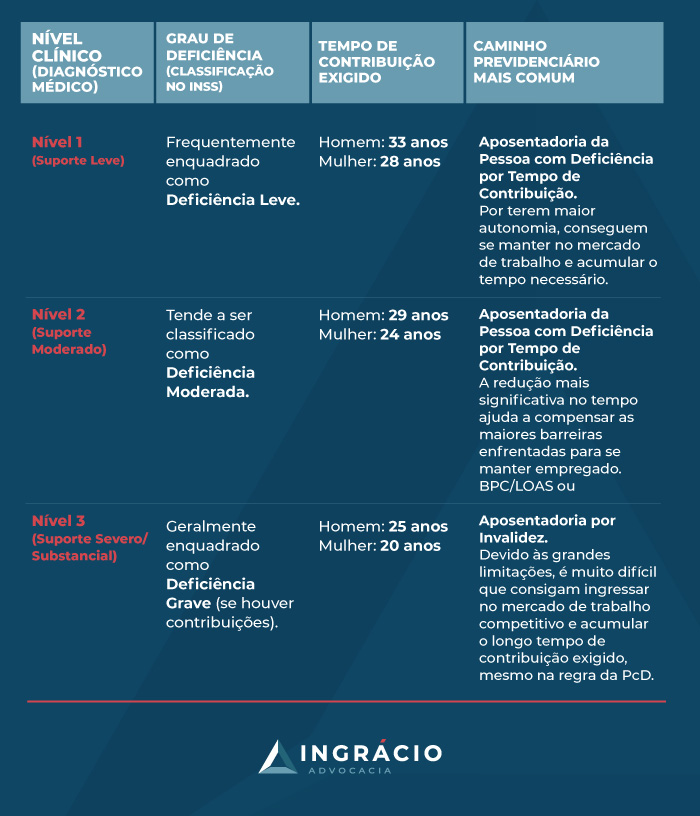 Desde o autismo nível 1 de suporte (anteriormente chamado de Asperger) até o nível 3 (suporte severo), a lei reconhece o TEA como uma deficiência e, portanto, garante o acesso a direitos previdenciários.