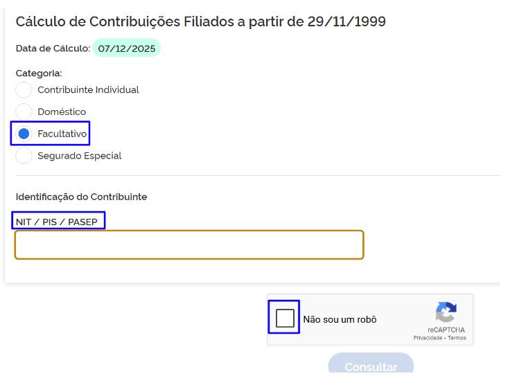 1. Selecione a categoria “Contribuinte Facultativo”, preencha o NIT e selecione a caixa para comprovar que não é um robô: