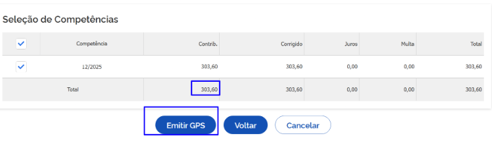 1. Ao final, confirme as informações e se estiver tudo certo, selecione a competência e clique em “Emitir GPS”: