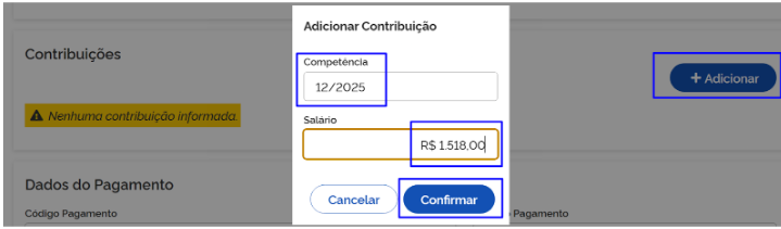 1. Na opção “Contribuições”, clique em “adicionar” e preencha o mês de competência do pagamento e o salário (o valor do salário pode ser de 1 salário mínimo até o teto do INSS):