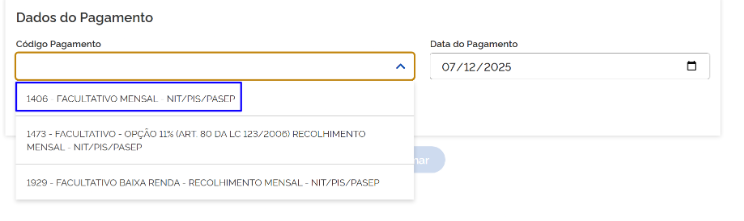 1. Na opção “Dados de pagamento”, selecione o código 1406 e informe a data do pagamento: