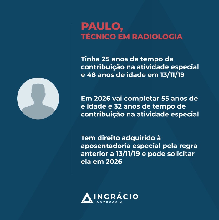 Em 2026, Paulo completará 55 anos de idade e poderá pedir a sua aposentadoria especial, já que adquiriu esse direito lá em 2019, quando atingiu os 25 anos de tempo de contribuição exigidos na atividade especial de risco baixo.
