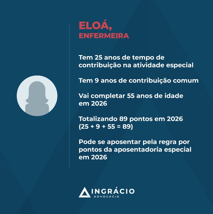 Assim, por preencher os 2 requisitos exigidos pela regra (86 pontos e 25 anos de contribuição na atividade especial), Eloá poderá se aposentar pela regra da aposentadoria especial por pontos aos 55 anos de idade em 2026.