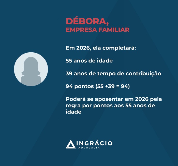 Veja que a Débora poderá se aposentar pela regra de pontos em 2026, já que possui 1 ponto a mais do que o exigido pela regra em 2026 (que é de 93 pontos).