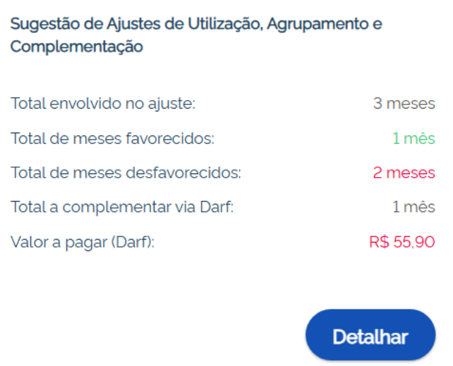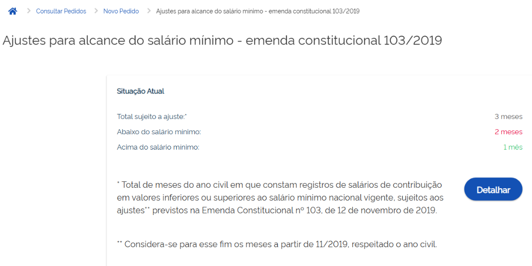 7- O INSS irá informar os meses pagos abaixo do mínimo e apresentar as opções para você. Clique em “Detalhar” na sugestão oferecida: