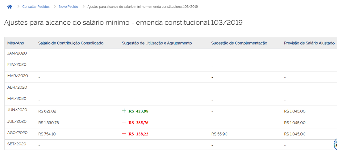 No exemplo acima, as contribuições de junho e agosto de 2020 foram abaixo do salário mínimo de 2020 (R$ 1.045,00) e, por isso, o INSS colocou os indicadores ao lado.