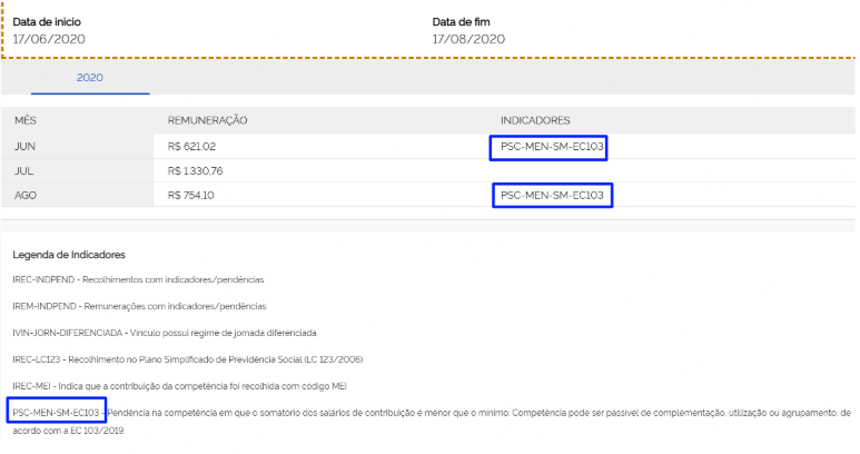 Quando tiver uma contribuição abaixo do mínimo, você verá o valor da remuneração inferior ao salário mínimo vigente no ano, pelo qual foi calculada a contribuição, e verá o indicativo “PSC-MEN-SM-EC103”, que aponta a pendência de uma contribuição abaixo do mínimo.