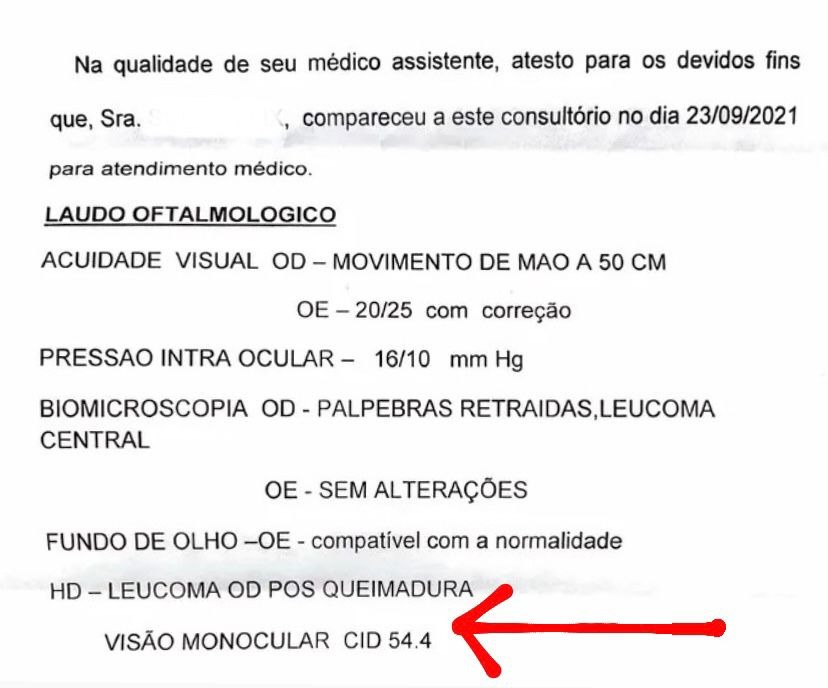 • Laudo médico oftalmológico detalhado: É o documento mais importante. Ele precisa confirmar a perda total ou quase total da visão em um dos olhos, com data, assinatura e identificação do médico, de preferência oftalmologista;