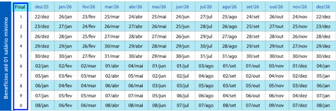 Para os segurados que recebem até um salário mínimo de benefício, os pagamentos referentes ao mês de janeiro de 2026 são pagos entre o dia 26 de janeiro e 6 de fevereiro de 2026.