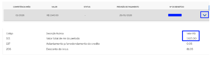 - Clique na seta referente a competência de janeiro de 2026 e veja se o seu benefício já foi atualizado: