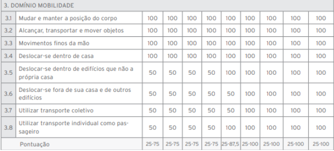 Como vimos, a menor pontuação (25) representa a dependência total para realizar uma determinada atividade, já a maior pontuação (100) está associada à inexistência de restrições ou limitações para realizar a atividade em relação a pessoas da mesma idade, cultura e educação sem limitações: