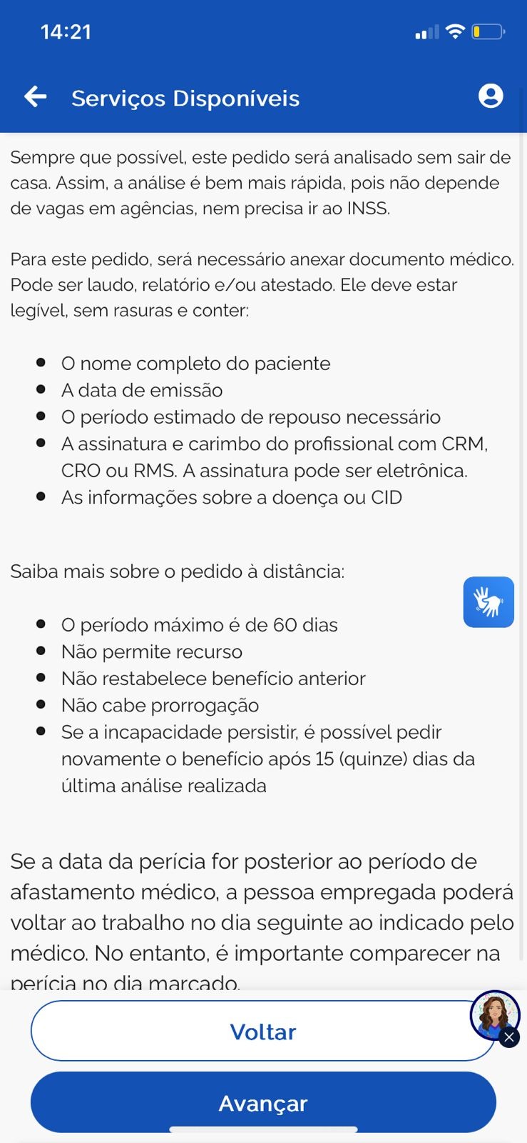 - Na próxima tela, leia com atenção todas as orientações relacionadas ao benefício por incapacidade e prossiga para a etapa seguinte clicando em “Avançar”;