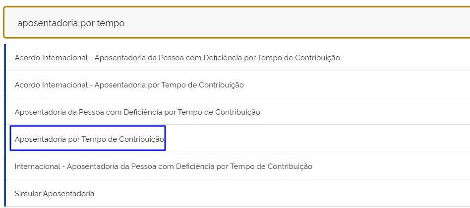 - Na página inicial, procure a lupa de pesquisa, digite “aposentadoria por tempo de contribuição” e clique nessa opção: