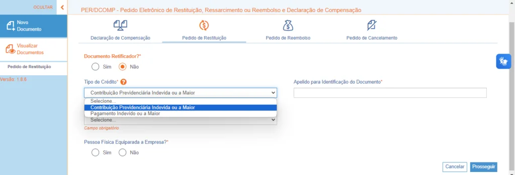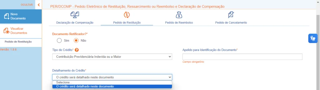 - Selecione o “Tipo de Crédito” chamado de “Contribuição Previdenciária Indevida ou Maior”: