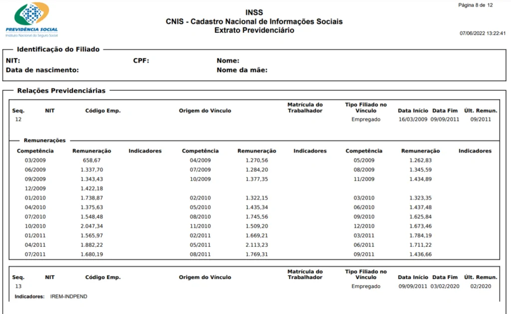 - extrato CNIS (Cadastro Nacional de Informações Sociais);