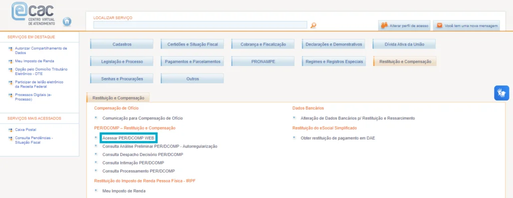- Escolha a opção “Acessar PER/DCOMP WEB”: