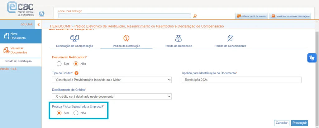 - Selecione “Sim” ou “Não” na opção “Pessoa Física Equiparada a Empresa?”: