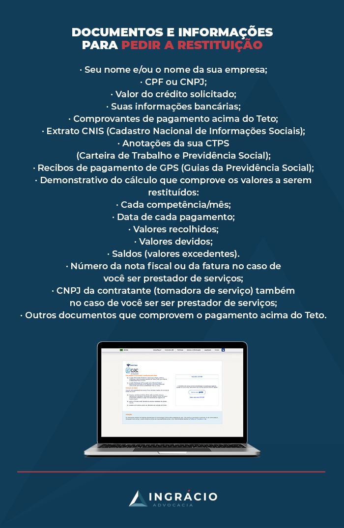 A documentação e as informações necessárias para pedir a restituição de contribuição previdenciária acima do Teto do INSS são as seguintes: