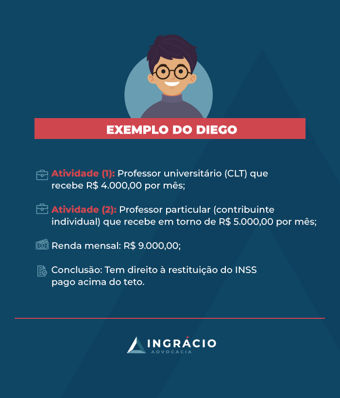 Portanto, como a contribuição previdenciária de Diego geralmente fica acima do Teto do INSS, ele tem direito à restituição.