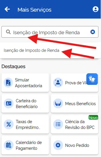 - Digitar “Isenção de Imposto de Renda” na barra onde aparece uma lupa e clicar nessa opção assim que ela surgisse na tela do seu celular ou computador: