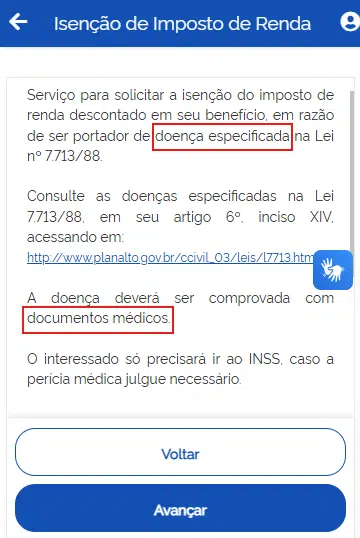 - Rolar a tela, ler as informações sobre a digitalização de documentos para agilizar a análise do seu pedido de isenção e clicar em “Avançar”: