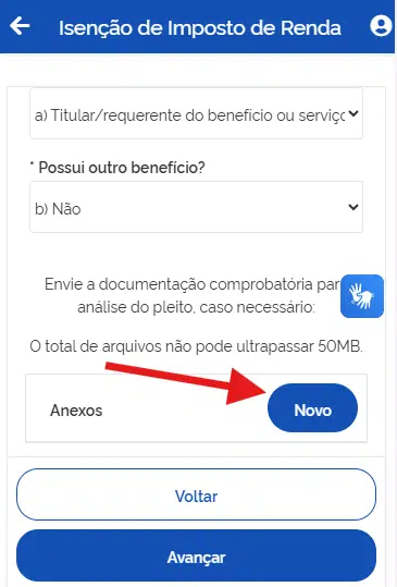 - Rolar a tela e clicar em “Novo” para anexar seus documentos médicos comprobatórios da doença grave: