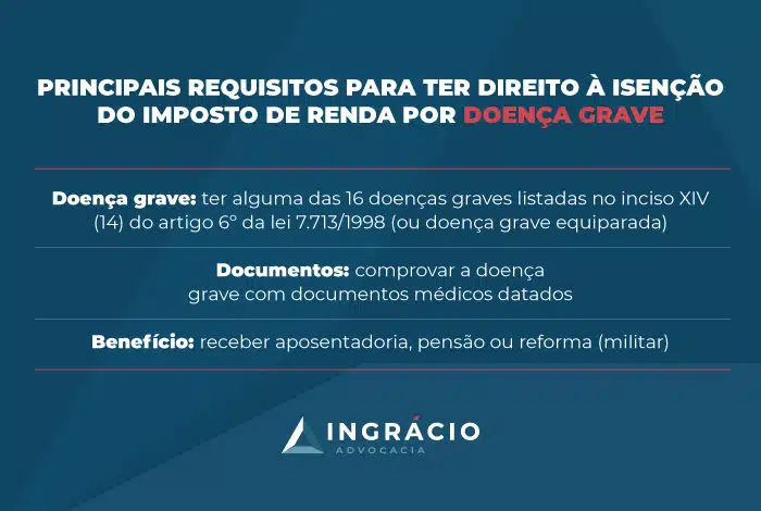 - Doença grave: Ter alguma das 16 doenças graves listadas no inciso XIV (14) do artigo 6º da lei 7.713/1998 (ou doença grave equiparada).